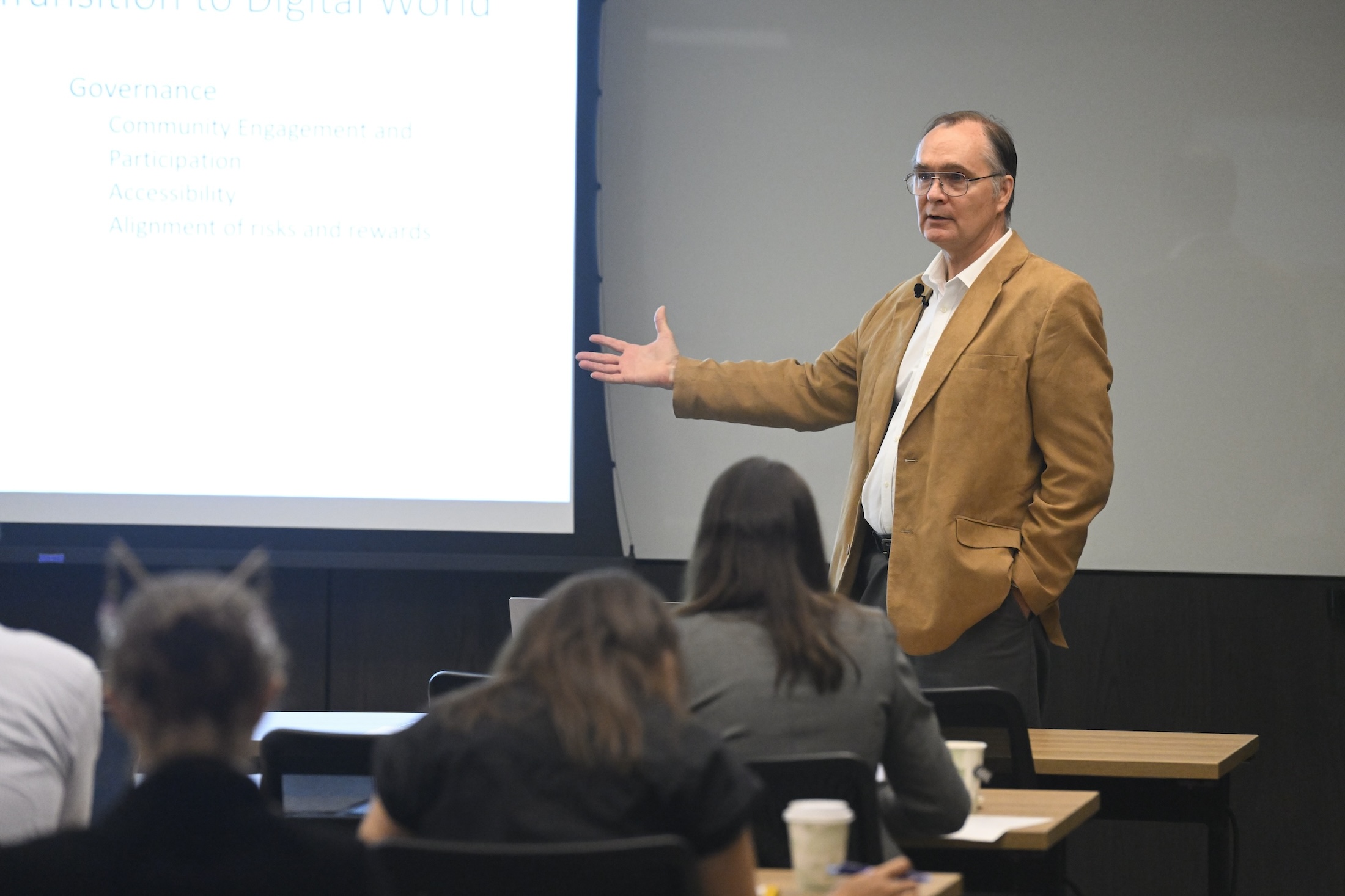 Speakers also discussed AI’s potential to transform and improve national security through its applications in areas including strategic planning, threat detection, and more. Speaker Jim Bellingham, Bloomberg Distinguished Professor, executive director of the Johns Hopkins Institute for Assured Autonomy, and director of safety and assurance in the Data Science and AI Institute, said that AI will also fundamentally change how we prepare for and fight wars, citing examples such as the use of small autonomous weaponized drones and ways AI applications could be used to help reinvent the national defense infrastructure.